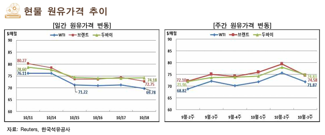 10월 셋째 주 국제 유가는 중동의 지정학적 긴장 완화, OPEC과 IEA의 올해 석유수요 전망치 하향 조정, 중국 원유정제량 감소, 리비아 원유 수출 회복 등으로 하락함.