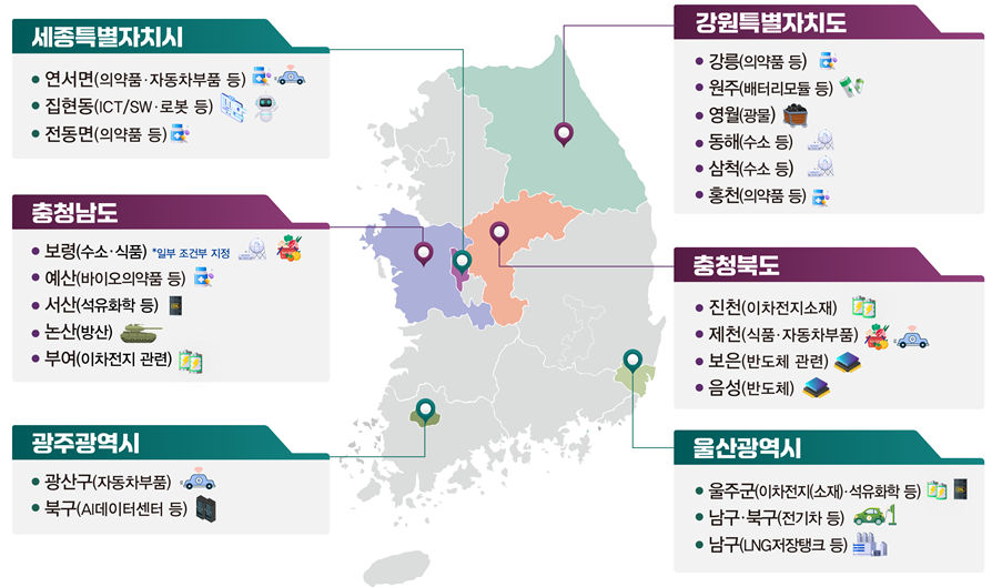 ⑤ (충청북도) 반도체·이차전지 소재 등 첨단산업을 비롯해 식품·자동차부품 관련 기업들이 유치된 제천·보은·음성·진천에 총 109.6만평 지정