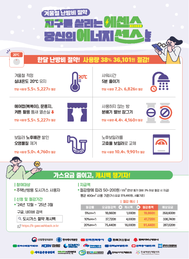 이밖에 도시가스 사용량을 전년 동기 대비 3% 이상 줄일 경우 절감량에 따라 캐시백을 제공하는 도시가스 캐시백도 운영하고 있습니다. 오는 12월 1일부터 전용 홈페이지(k-gascashback.or.kr)에서 신청 가능합니다.