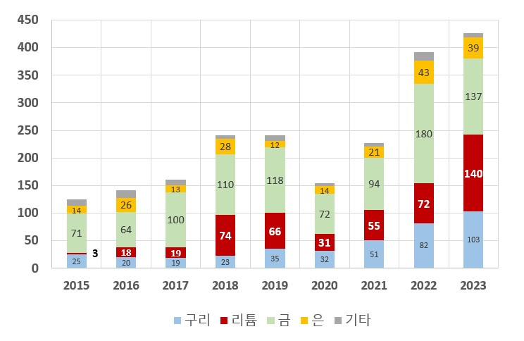 리튬은 상온에서 고체인 알칼리 금속으로, 전기 전도성이 매우 높아 전기차 배터리와 에너지 저장 장치의 필수 원료로 사용되고 있다. 기후변화와 글로벌 넷제로 목표 달성을 위한 전기차 보급 확산과 더불어 급격한 리튬 수요 증대로 점차 그 중요성이 더해지고 있는 핵심 원료다. 탄산리튬의 HS코드는 2836.91.00, 수산화리튬의 HS코드는 2825.20.20, 산화리튬의 HS코드는 2825.20.10이다.