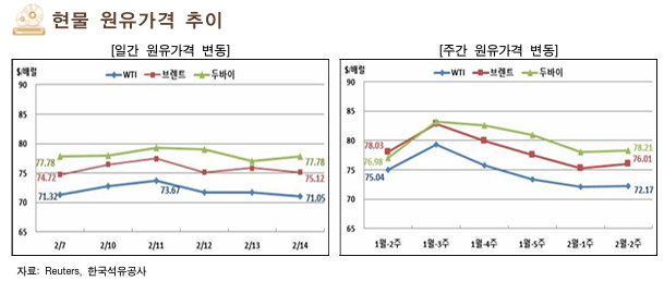2월 둘째 주 국제 유가는 제재에 따른 러시아 생산량 축소 등 상승 요인과 미국 관세정책으로 인한 인플레이션 및 세계 경제 둔화 우려 등 하락 요인이 교차하며 보합세를 나타냄.