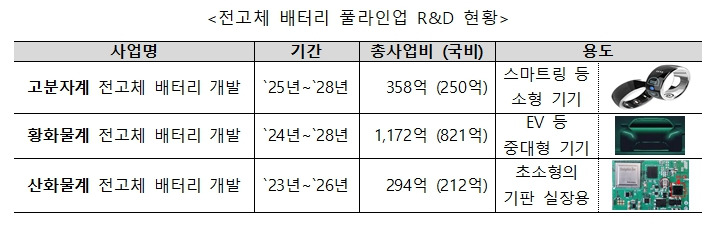 이 가운데 고분자계 전고체 배터리는 스마트워치, 가상현실(VR) 헤드셋, 무선이어폰, 스마트 링 등 인체 밀착형 소형 기기에 쓰이는 배터리로, 이번 사업에서는 경량화·고에너지 밀도·고안전성을 동시에 달성하는 것을 목표로 합니다. 이를 통해 가벼우면서 충전 부담이 덜하고 화재 걱정이 없는 웨어러블 기기 시대를 앞당길 수 있을 것으로 기대됩니다.
