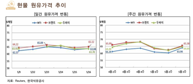 5월 셋째 주 국제 유가는 미국과 중국의 한시적 관세 인하 합의와 미국 물가상승률 둔화 등으로 상승했고, 미국-이란 간의 핵 협상 진전 등은 상승폭을 제한함.