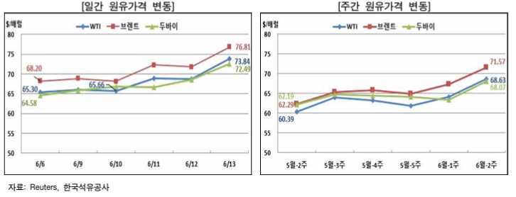 6월 둘째 주 국제 유가는 중동지역의 군사적 긴장 고조와 미-중 무역 합의 등으로 상승했고, 세계은행의 세계 경제성장률 하향 조정 등은 상승폭을 제한함.