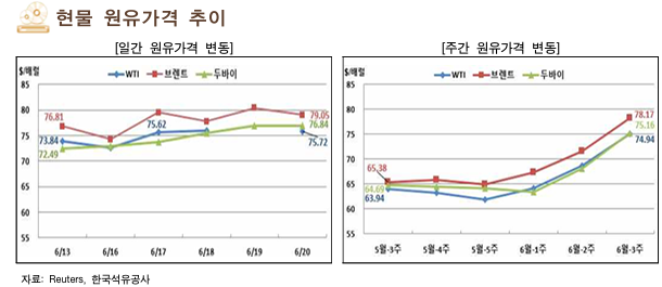 6월 셋째 주 국제 유가는 이스라엘과 이란 간 무력 충돌 심화로 인한 미국의 직접 군사 개입 위협 및 호르무즈 해협 봉쇄 가능성 등의 영향으로 상승함.