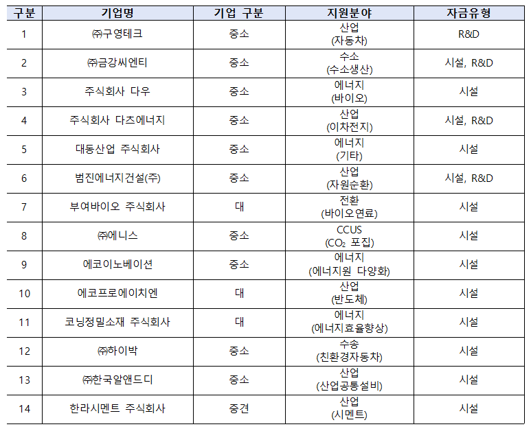 14개 탄소감축 투자 기업에 오는 2027년까지 총 1521억원의 융자금이 지원됩니다.