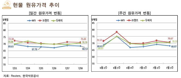 7월 셋째 주 국제 유가는 러시아 추가 제재 유예, OPEC+ 증산량 확대 전망 등 하락 요인과 견고한 석유 수요 전망 및 이라크 유전 공격 등 상승 요인이 교차하며 보합세를 나타냄.