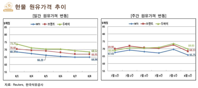 8 월 첫째 주 국제 유가는 의 추가 증산 결정과 미러 정상회담에 대한 기대감 등으로 , 하락했고 러시아 석유 수입국에 대한 미국의 압박 등은 하락폭을 제한함.
