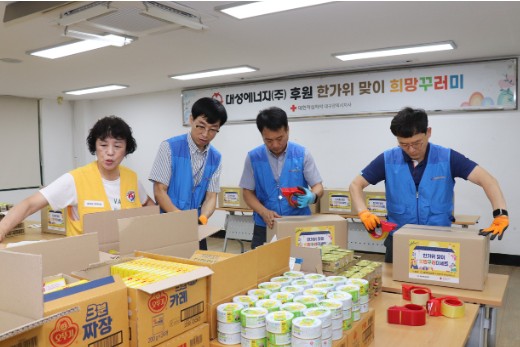 이날 행사에 참여한 대성에너지 직원들은 적십자사봉사회 남구협의회와 함께 추석 명절에 꼭 필요한 식료품, 통조림, 건강기능식품 등 8종의 생필품으로 구성된 희망꾸러미 선물 세트를 포장부터 직접 가정 방문까지 참여해 따뜻한 마음을 전했다.