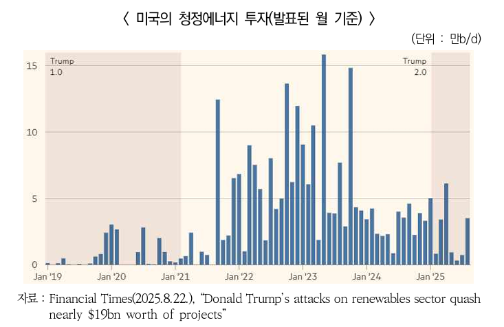 1)‒ Atlas Public Policy 집계에 따르면, 2025년 들어 총 186억 달러 규모의 청정에너지 프로젝트가 취소되었는데, 이는 2024년의 8억 2,700만 달러 대비 크게 증가한 것임.