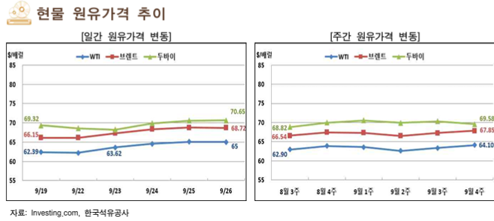 9월 넷째 주 국제 유가는 러시아의 수출제한 정책 및 베네수엘라 원유 수출 제재 등 상승 요인과 이라크 쿠르드지역 원유 수출 재개 등 하락 요인이 교차하며 보합세를 나타냄.