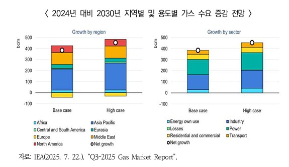 ▶ 기준 시나리오 전망에 따르면, 2030년 650억㎥/년의 공급 과잉이 예상됨. 이에 따라 가격이 하락하면 가격에 민감한 아시아 수요가 증가할 수 있음. 다만, 공급 기반 시설이 확충되지 않으면 동남아 등의 추가 수요가 실현되지 못할 위험이 있음.
