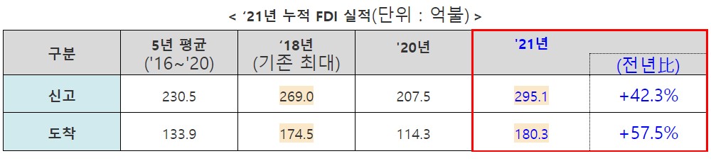 □ (실적) '21년 전체 외국인직접투자(FDI)는 신고기준 전년 대비 42.3% 증가한 295.1억불, 도착기준 57.5% 증가한 180.3억불을 기록하여 역대 최대치 달성