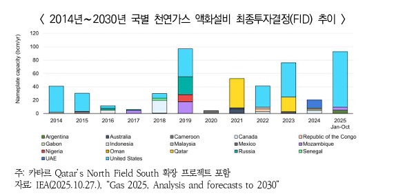 ▶ 미국 정부의 LNG 수출 허가 동결 해제로 2025년 1∼10월 중 미국에서 800억㎥/년 이상의 용량에 대한 최종투자결정(FID)이 완료됨. 이에 따라 북미 계약의 비중이 2025년 들어 66%로 증가함.