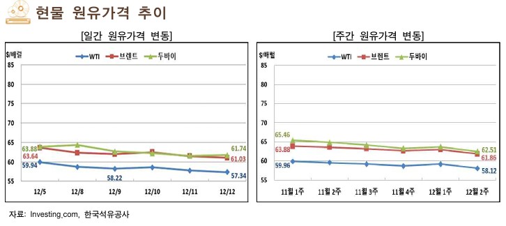12월 둘째 주 국제 유가는 원유 초과공급 우려 완화와 이라크 유전 생산 재개 등으로 하락했고, 러시아와 베네수엘라에 대한 압박 등은 하락폭을 제한함.