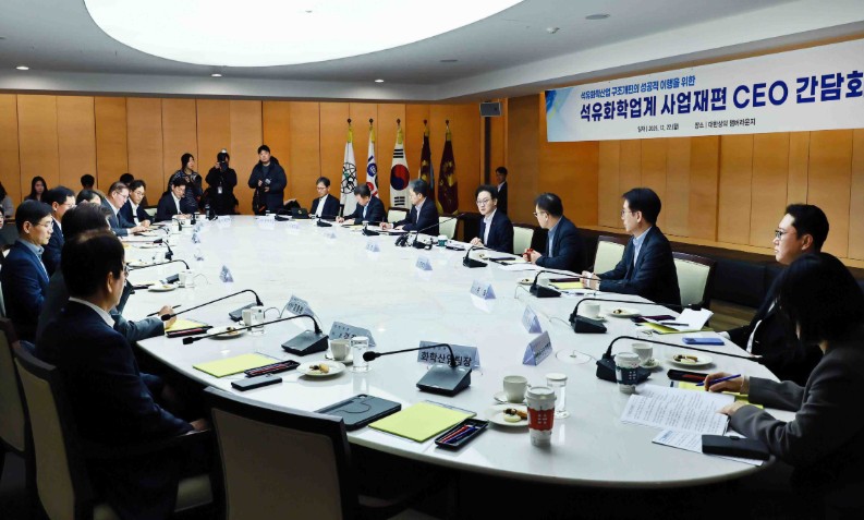 김정관 산업통상부 장관은 2025. 12. 22.(월) 14:00 서울 중구 대한상공회의소 챔버라운지에서 이영준 롯데케미칼 사장, 김종화 SK지오센트릭 사장, 김종현 DL케미칼 부회장, 조남수 HD현대케미칼 대표, 허성우 GS칼텍스 부사장, 류 열 에스오일 사장, 김동춘 LG화학 대표, 이천석 효성화학 대표, 김철진 SK어드밴스드 대표, 남정운 한화솔루션 사장, 엄찬왕 한국화학산업협회 부회장을 비롯한 석유화학업계 대표 등 관계자가 참석한 가운데 열린 「석유화학업계 사업재편 CEO 간담회」를 주재하고, 인사말을 한 후 사업재편안을 제출한 석유화학기업들을 대상으로 사업재편 관련 의견을 수렴하고 신속한 추진을 독려하였다.