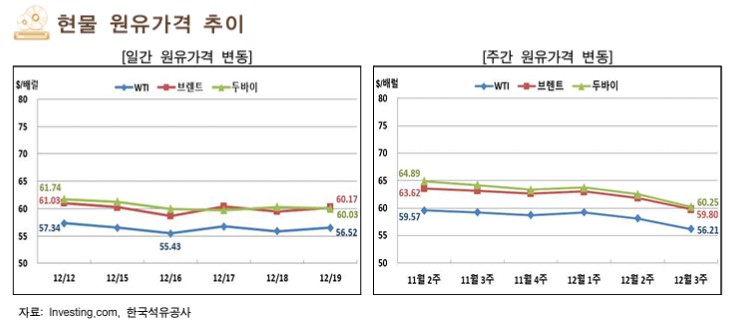 12월 셋째 주 국제 유가는 중국 경제지표 부진, 러시아-우크라이나 종전 기대감 등으로 하락했고, 미국-베네수엘라 갈등 지속 등은 하락폭을 제한함.