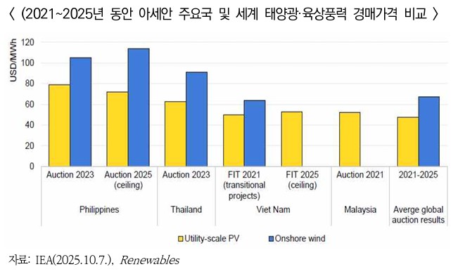 ▶ 최근 몇 년 동안 태양광 및 육상풍력 발전비용이 전 세계적으로 하락했음에도 불구하고 아세안 국가들의 태양광 및 육상풍력 발전단가는 여전히 세계 평균 비용보다 높은 수준임.