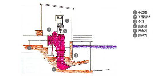 수압판과 수차,흡출관 부분으로 연결되는 곳에 조절 밸부가 있고 그 윗부분으로 연관되어 있는 구조에는 변속기와 발전기가 설치되어 있다. 수면 아래로는 수차와 흡출관 부분이 자리잡고 있다.