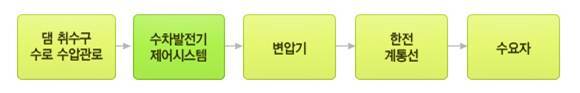 댐 취수구 수로 수압관로에서 수차발전기 제어시스템을 거쳐 변압기와 한전 계통선 을 통해 수요자에 이름