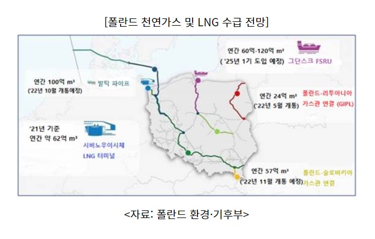 폴란드의 주요 가스 공급처는 국영기업인 PGNiG사로 가스 생산, 수입, 판매 및 서비스 등의 모든 가스 사업을 총괄하고 있으며 폴란드 전체가스시장의 공급량의 85%를 점유, 약 200억m³를 공급하고 있다. 동 사의 가스 공급현황 자료에 따르면, ‘21년까지는 야말(Yamal)-유럽 파이프라인을 통해 러시아에서 들어오는 천연가스가 가장 많은 것으로 나타났다.