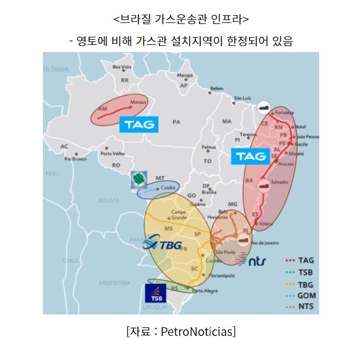 2016년까지 페트로브라스는 브라질의 모든 가스관을 소유하고 있었다. '산업에너지 소비자 협회(Abrace)'는 신규법이 통과되어 가스 인프라에 매년 600억 헤알이 투자되고 투자액이 2030년까지 1,500억 헤알로 증가할 수 있다"고 언급했다. 가스관 운영회사 NTS, TAG는 민영화가 완료되었고 가스관 운영회사 TBG와 가스 유통회사 가스페트로(Gaspetro)는 민영화 막바지 작업에 있다.