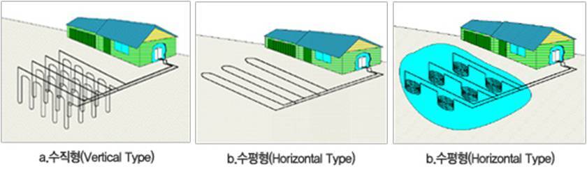 - 폐회로시스템(폐쇄형)은 루프의 형태에 따라 수직, 수평루프시스템으로 구분되는데 수직으로 100~150m, 수평으로는 1.2~1.8m정도 깊이로 묻히게 되며 상대적으로 냉난방부하가 적은 곳에 쓰임