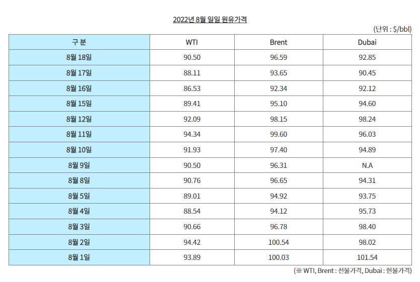 2022년 8월 일일 원유가격