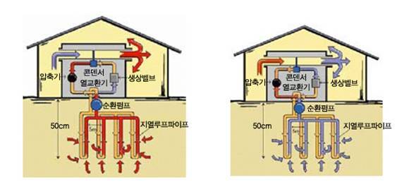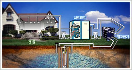 • 태양열의 약 47%가 지표면을 통해 지하에 저장되며, 이렇게 태양열을 흡수한 땅속의 온도는 지형에 따라 다르지만 지표면 가까운 땅속의 온도는 개략 10℃∼20℃정도 유지해 열펌프를 이용하는 냉난방시스템에 이용