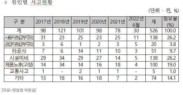 가스 안전사고 발생원인별로는 사용자 취급부주의와 시설미비가 각 138건(각 26.2%)으로, 해당 두 원인들이 절반 이상(52.4%)를 차지하는 것으로 나타났다. 이어 제품노후·고장이 100건(19.0%), 기타 74건(14.1%) 등 순이었다.