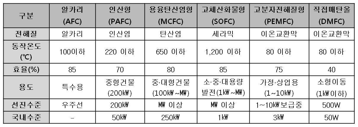 ※AFtC(Alkaline Fuel Cell), PAFC(Phosphoric Acid FC), MCFC(Molten Carbonate), SOFC(Solid Oxide), PEMFC(Polymer Electrolyte Membrane), DMFC(Direct Methanol) → 순서대로 기술발전 단계임