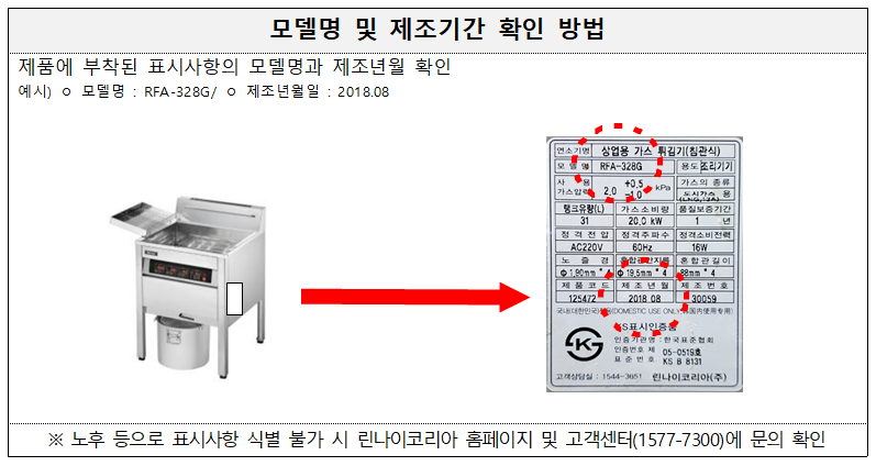 해당 제품을 사용하고 있는 업소는 린나이코리아 홈페이지(www.rinnai.co.kr)와 고객지원센터(1577-7300), 이메일(recall-fryer@rinnai.co.kr)로 연락해 무상 수리를 받을 수 있습니다.