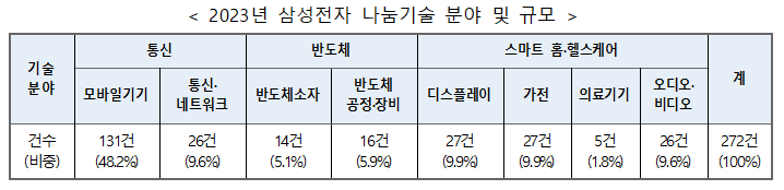 삼성전자가 모바일기기, 반도체소자, 디스플레이 등 8개 분야에서 272건의 특허를 무상으로 나눔합니다.