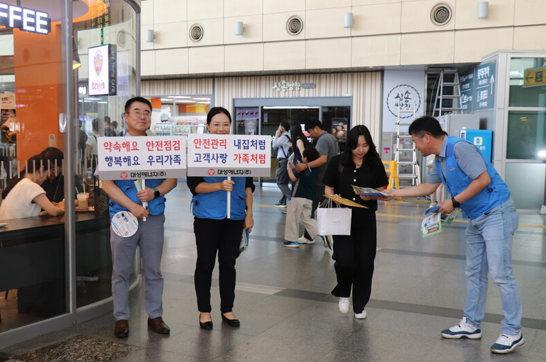 이번 안전문화 캠페인에는 대성에너지 외에도 한국가스안전공사 대구광역본부, 한국산업안전보건공단 대구광역본부 임직원들도 함께 참가해 총 40명이 동대구역사 내·외부를 5구역으로 나누어 시민들에게 가스안전사고 예방 및 안전수칙에 관한 홍보물을 배포했다.