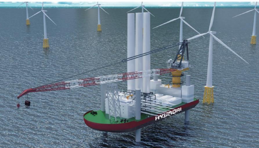 ‘현대 포론티어호’로 명명된 이 선박은 기자재 운반 바지선과 설치 바지선을 별도로 운용하던 기존 방식과 달리 1척으로 운반과 설치를 할 수 있도록 일체화했습니다. 덕분에 풍력터빈을 해상에 보다 안정적으로 설치할 수 있고 작업 속도도 50% 이상 향상될 것으로 기대됩니다.