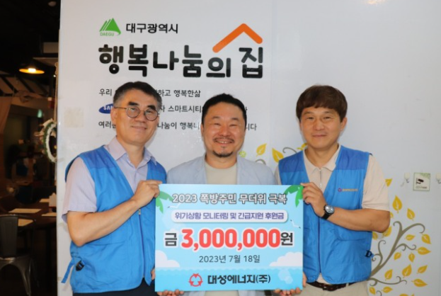 [헤럴드경제(대구)=김병진 기자]대성에너지는 18일 중구 서성로에 위치한 대구 쪽방상담소 ‘행복나눔의 집’을 찾아 ‘2023년 쪽방 무더위 극복 캠페인’ 후원금 300만원을 기탁했다.
