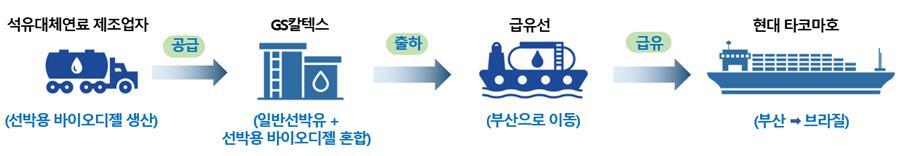 첫 시범 운항 선박은 15일 밤 8시 부산에서 브라질 파라나구아로 가는 HMM의 현대타코마호이며, 여기엔 GS칼텍스가 공급한 선박용 바이오디젤 30%가 혼합됩니다.