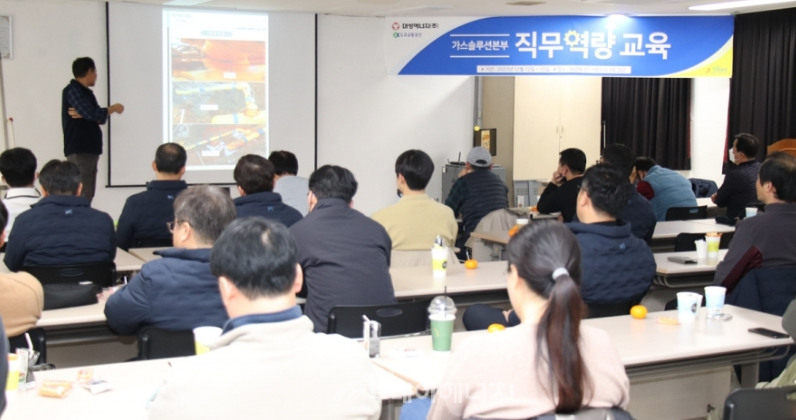교육과정은 △안전관리업무 시스템 △법령 및 규정, 지침 △사고통계 및 관련 법령 관리 △굴착공사, 시설물점검 시 관리 포인트 △ 도시가스사업법 등 업무수행 시 필요로 하는 내용으로 구성됐으며 현장 경험이 풍부한 팀장급으로 구성된 사내강사가 직접 강의에 나서 분야별로 전문적이고 심도 깊은 교육을 통해 직원들의 기술 역량이 한층 높아질 것으로 기대하고 있다. 대성에너지 장환석 가스솔루션본부장은 “사내 우수한 사내강사들이 자부심을 가지고 후배들에게 주기적이고 반복적인 직무교육을 실시함으로써 업무 능력배양과 안전의식 고취는 물론 사고발생시 어떤 상황에도 신속하게 대처할 수 있는 역량을 키우는 것이 중요 하다”며 지속적인 직무훈련과 교육을 통해 비상사태에 대한 최적화된 대응시스템을 구축해 나가도록 최선을 다하겠다고”말했다.