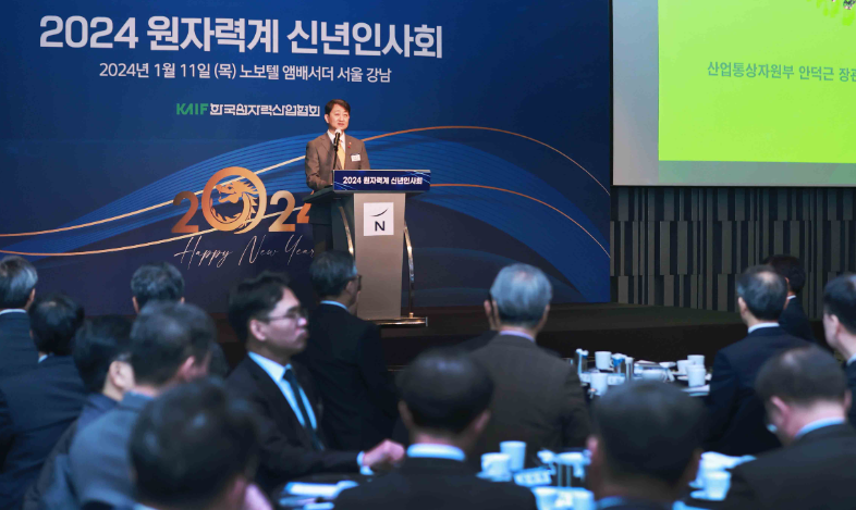 안덕근 산업통상자원부 장관은 2024. 1. 11(목) 07:20 서울 삼성동 노보텔 앰배서더호텔에서 한주호 한국원자력산업협회장을 비롯한 정부, 관련 유관기관 및 기업 대표 등 관계자 200여명이 참석한 가운데 열린 「2024년 원자력계 신년 인사회」에 참석하여, 축사를 한 후 신년 인사회를 축하는 떡 케익 절단식을 가졌다.