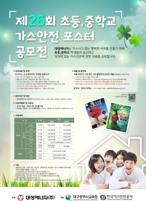 대성에너지(주)는 가스 자율점검 생활화와 안전의식 향상을 위해 오는 24일부터 9월 2일까지 초등·중학교 재학생을 대상으로 '제26회 가스안전 포스터 공모전'참가 작품을 접수한다고 3일 밝혔다