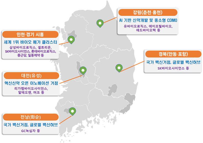 강원(춘천‧홍천)은 인공지능 기반의 신약개발과 중소형 위탁개발생산(CDMO) 거점으로 조성합니다. 기존의 바이오 인프라와 주변 지역과의 연계‧확장을 통해 바이오산업 발전을 추진한다는 계획입니다.