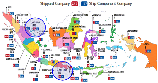 그림에서 확인할 수 있듯이 인도네시아 조선소는 전국 각지에 분포돼 있는데, 주로 싱가포르와 인접한 리아우섬(Island RIAU) 내 바탐지역에 조선소가 밀집돼 있으며, 그다음으로는 수라바야시가 있는 동부자바(Jawa Timur)에 중소형 조선소가 많이 분포돼 있다.