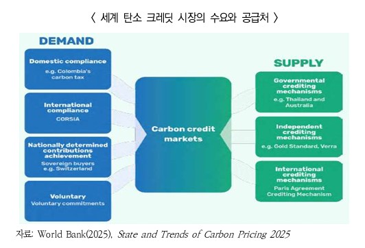 탄소 크레딧은 과거 시장별로 분리된 형태로 운영되어 왔으나 최근 규제-자발적 시장, 국내-국제 시장 간 경계가 허물어지며, 수요와 공급이 다양화·중첩화됨.
