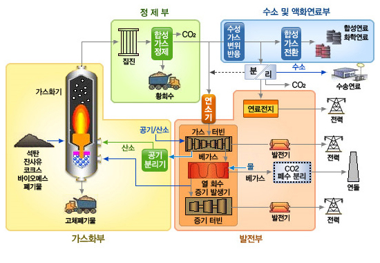 가스화 복합발전기술(IGCC:Integrated Gasification Combined Cycle)은 석탄, 중질잔사유 등의 저급원료를 고온·고압의 가스화기에서 수증기와 함께 한정된 산소로 불완전연소 및 가스화시켜 일산화탄소와 수소가 주성분인 합성가스를 만들어 정제공정을 거친 후 가스터빈 및 증기터빈등을 구동하여 발전하는 신기술