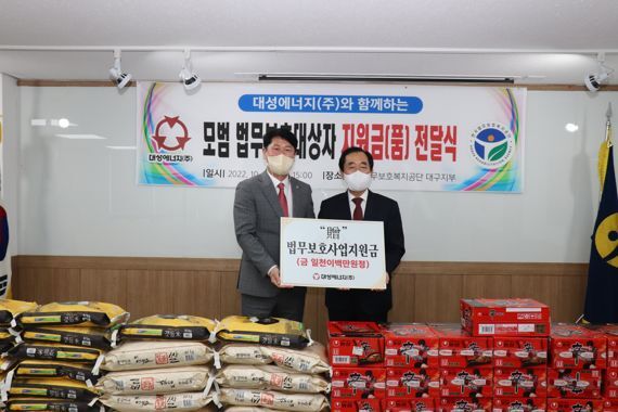대성에너지㈜와 한국법무보호복지공단 대구지부는 지난 20일 오후 법무보호대상자들의 건강한 사회복귀 지원을 위한 아름다운 동행 후원금 전달식을 가졌다고 21일 밝혔다.