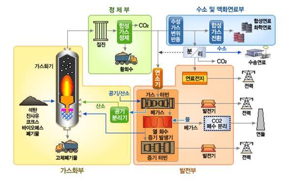 가스화부:석탄,잔사유,코크스,바이오매스,폐기물을 가스화하고 고체폐기물을 배출함