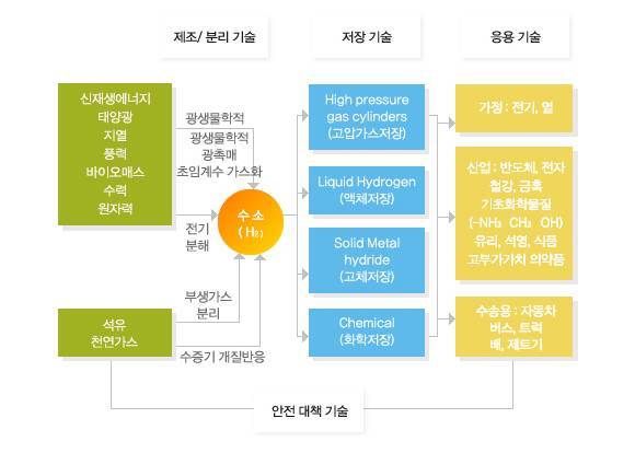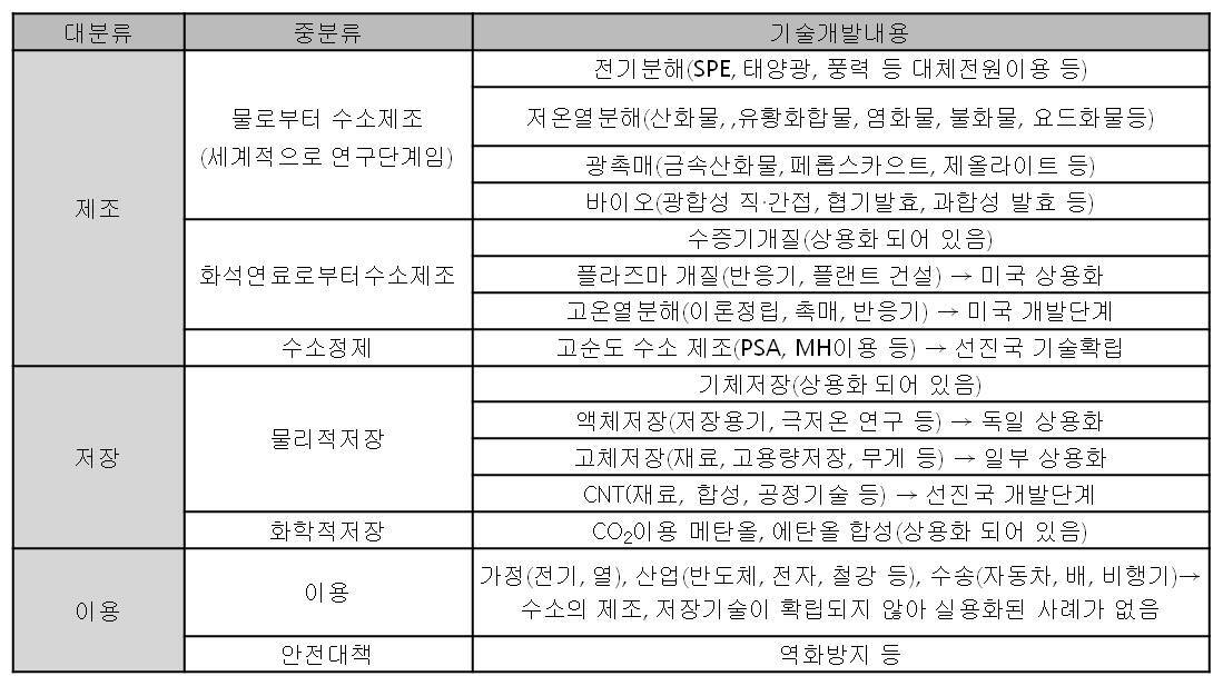①제조/분리기술:신재생에너지, 태양광,지열,풍력,바이오매스,수력,원자력에서 광생물확적 광촉매를 이용하거나 초임계수 가스화. 또 석유,천연가스에서 부생가스분리 또는 수증기 개질반응으로 수소를 얻는 기술