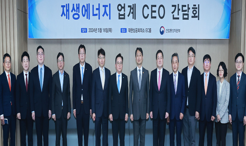 안덕근 산업통상자원부 장관은 2024. 5. 16(목) 16:40 서울 중구 대한상공회의소 EC룸에서 이계인 포스코인터내셔널 대표, 김수연 GS풍력발전 대표, 박종환 HD현대에너지솔루션 대표, 구본규 LS전선 대표, 이원휘 동국 S&C 대표, 김수진 삼성전자 부사장, 박지원 LG에너지솔루션 부사장, 신동진 한화솔루션 부사장, 김정관 두산에너빌리티 부사장, 홍성민 태양광산업협회장, 박경일 풍력산업협회장을 비롯한 재생에너지 관련 개발사, 태양광·풍력제조사, RE100 수요기업 및 협회 대표 등 관계자가 참석한 가운데 열린 「재생에너지 업계 CEO 간담회」를 주재하고, 인사말을 한 후 재생에너지 보급 확대 및 공급망 강화 전략을 발표하고 국내 재생에너지 주요 업계 의견 및 애로사항을 청취·논의하였다.
